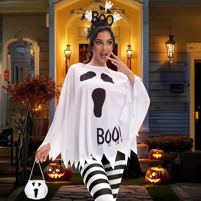 4 PCS Halloween Costume Set for Women Adult Ghost Costume, Ghost Poncho for Female, Candy Bag, Headband and Striped Tights, Unique Cute Halloween Costumes Woman 2025 for Party Cosplay