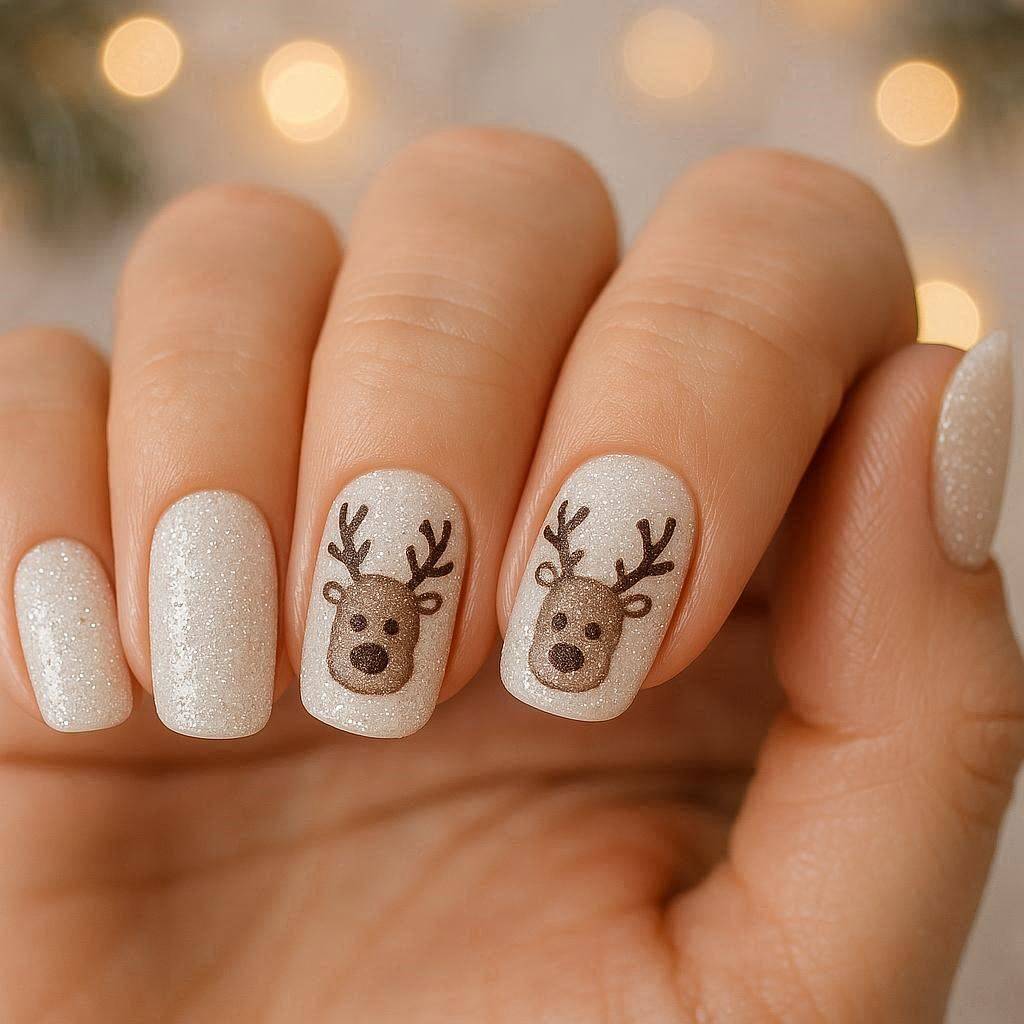 Bright white nails with a dusting of glitter and reindeer accents. Clean, sparkly, and perfect for snowy days.